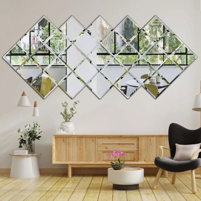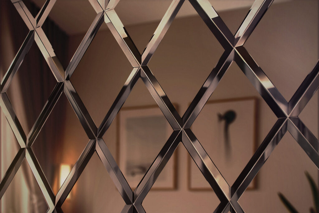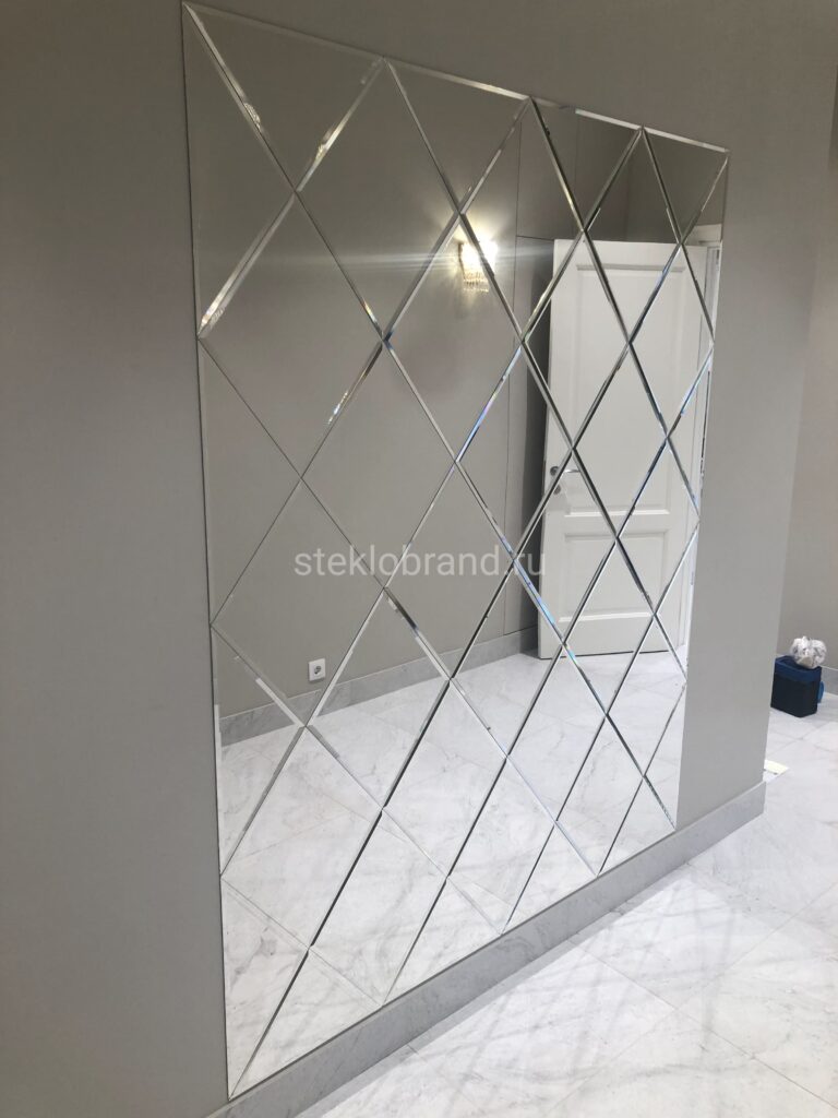 Зеркальные панно представляют собой сложные композиции, составленные из отдельных зеркальных элементов, идеально соединённых между собой для создания эстетически безупречной поверхности. Обычно такие панели включают обработку фацетом, что добавляет им изысканности. Ширина фацета может варьироваться от 5 до 20 мм. Наиболее популярные формы элементов — это ромбы, квадраты, прямоугольники и треугольники. Панно можно доставить в виде готового изделия, смонтированного на специальной подложке, либо собирать на месте. Минимальные зазоры между элементами (до 2 мм) помогают сохранить целостный внешний вид.