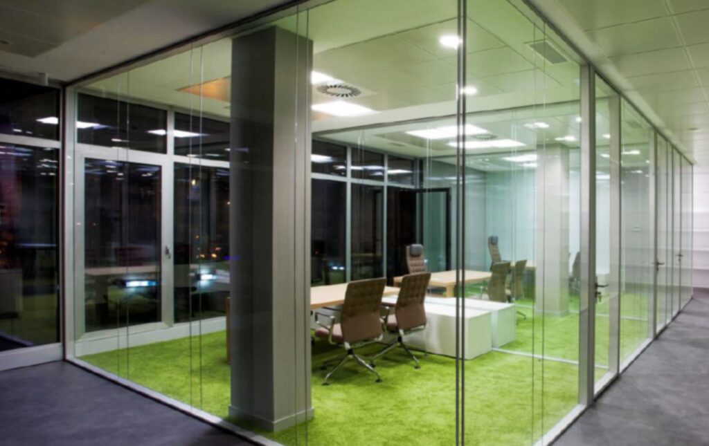 - Перегородки: Стеклянные перегородки помогают зонировать пространство, не загромождая его и добавляя свет и лёгкость в интерьер.