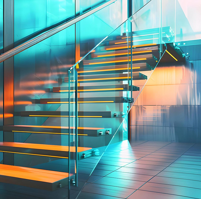 - Ограждения и перила: Стеклянные ограждения обеспечивают безопасность и визуальную лёгкость конструкции, идеально подходя для лестниц, балконов и террас.